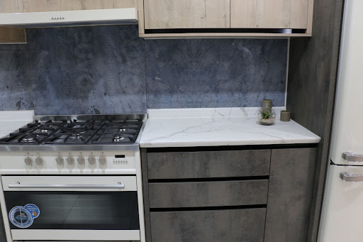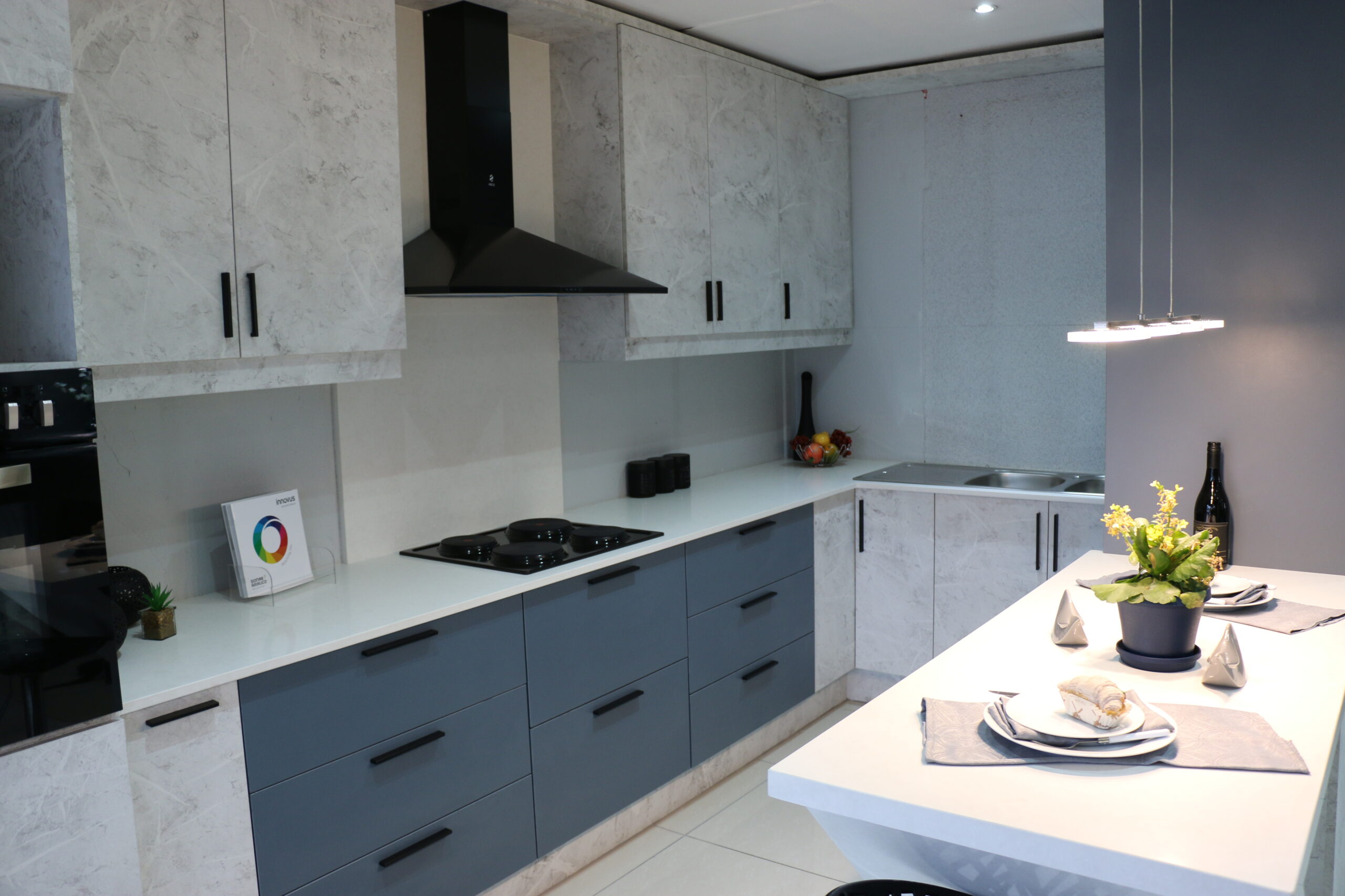 Atlas Kitchens quickly highlights Shadow Blue, specifically in the Silhouette finish, and Natural Concrete. Both of which are their favourite two décors and the most popular in their showroom. Their centrepiece kitchen design features an exquisite combination of Shadow Blue and Bianco.